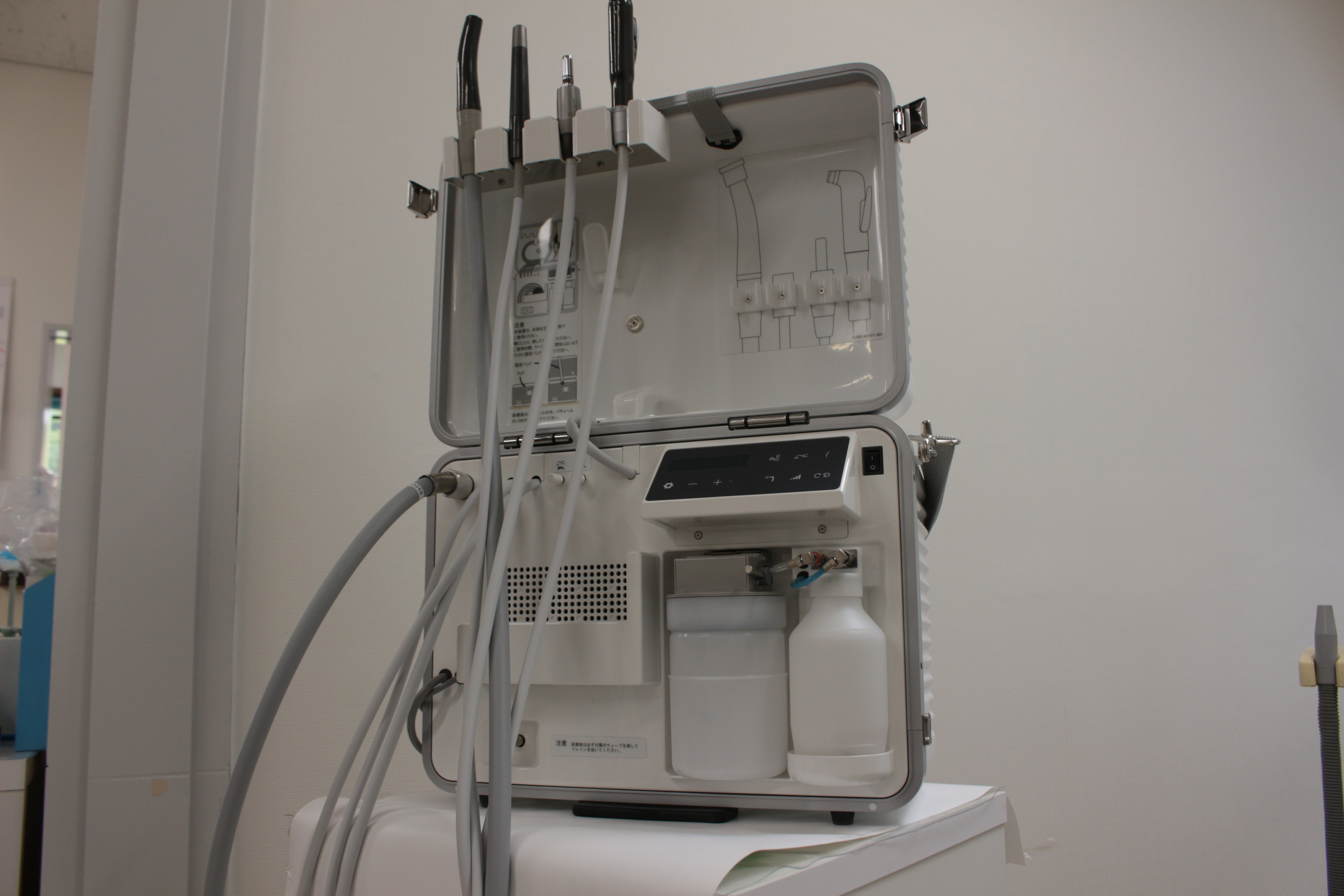 | ポータブルユニットとは、歯科医院の診療台についている歯を削る器具や、水で吸うための器具が持ち運び可能に作られた機器です。スペースをさほど必要としない為、患者様のご自宅に持ち込み、椅子やベット横に設置して治療を行えます。(コンセントをお借りします) | ポータブルユニット同様、患者様のご自宅に持ち込み義歯の調整などを行う機器です。この機器を用いることで、義歯の欠損、破損などの修理をその場で行うことができます。(コンセントをお借りします) |