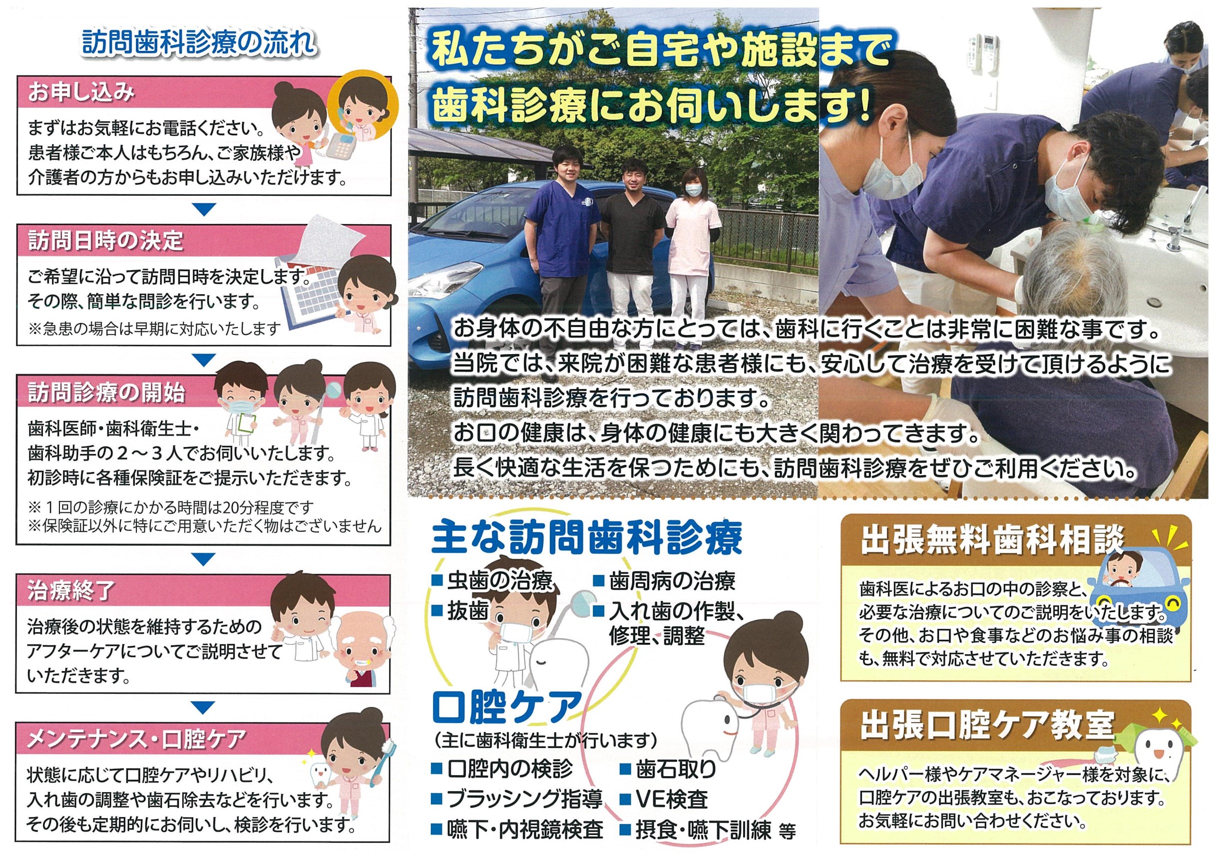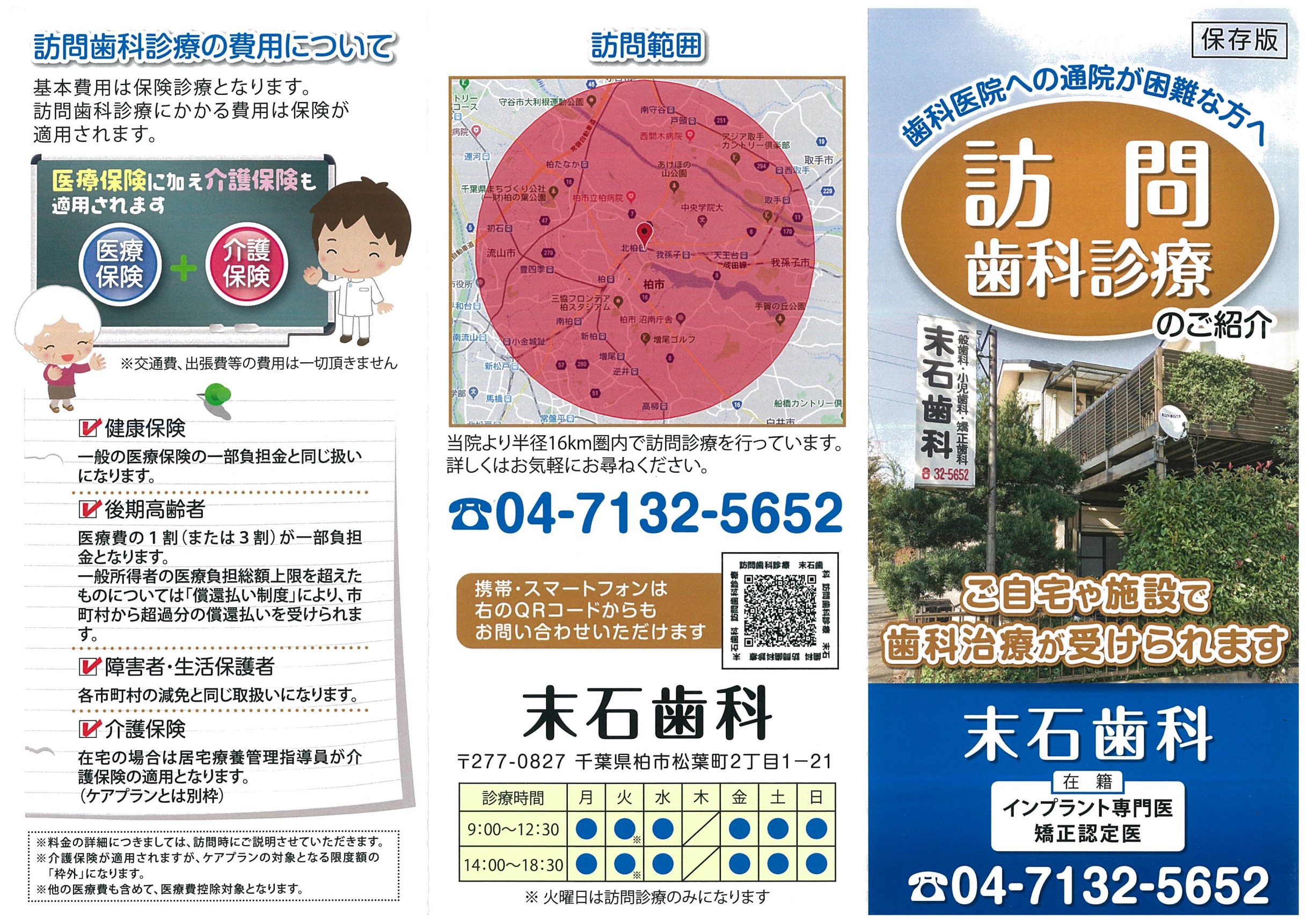 主に「柏市・我孫子市・流山市」となります。地域によっては訪問が難しい場合もございます。訪問先の近くの歯科医院をご紹介させて頂きます。お電話にてご相談下さい。