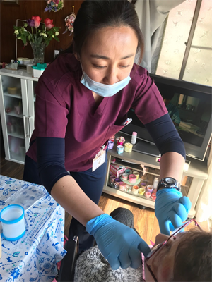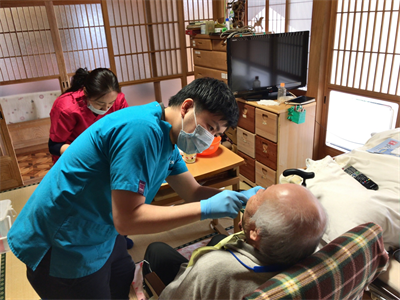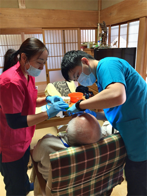 治療計画を立案し、患者様一人ひとりに合わせた治療を行います。担当医師、歯科衛生士等と連携して、チームで治療にあたります。訪問歯科診療用器具を取りそろえていますので、ベッドや車いすでの治療が可能です。ご家族様の都合があわなくても、看護師さん介護士さんと連携して治療や口腔ケアを行います。